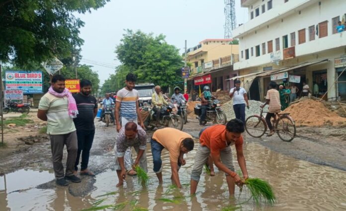 गाजीपुर। जनपद गाजीपुर के आदर्श बाजार की जर्जर सड़कों को लेकर लोगों का सब्र आखिरकार जवाब दे गया। ब्लू बर्ड स्कूल के सामने की सड़क पर जलभराव और गड्ढों से परेशान स्थानीय लोगों ने अनोखा विरोध प्रदर्शन करते हुए सड़क के गड्ढों में धान की रोपाई कर अपनी पीड़ा जाहिर की। बारिश के मौसम में जलजमाव के कारण सड़कें कीचड़ और दलदल में तब्दील हो चुकी हैं, जिससे राहगीरों, स्कूल जाने वाले बच्चों, बाइक सवारों और टेंपो चालकों को रोजाना भारी दिक्कतों का सामना करना पड़ रहा है।