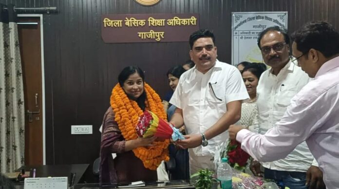 नवागत बीएसए का पुष्प गुच्छ व प्रतीक चिह्न देकर किया स्वागत