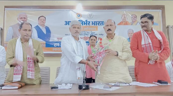 गाजीपुर। प्रधानमंत्री नरेंद्र मोदी सेवा पखवाड़ा अंतर्गत शुक्रवार को आत्मनिर्भर भारत संकल्प अभियान की जिला कार्यशाला भाजपा जिलाध्यक्ष ओमप्रकाश राय की अध्यक्षता में जिला कार्यालय पर हुई ।कार्यशाला को संबोधित करते हुए जिला प्रभारी डा. राकेश त्रिवेदी ने कहा कि विकसित भारत के निर्माण मे हमे स्वदेशी उत्पादों की खरीदारी पर जोर देने की आवश्यकता हैं। जिससे आर्थिक स्वावलंबन स्थानीय उद्योगों को समर्थन और घरेलू उत्पादों को बढ़ावा देना जरूरी है।देश के प्रधानमंत्री नरेंद्र मोदी के नेतृत्व में हम इस ओर तेज गति से अग्रसर हो रहे हैं। उन्होंने कहा कि कोरोना काल के दौरान ही हमने आत्मनिर्भर बनने की शुरुआत कर दिया है ।भारत के विकास के लिए सरकार और नागरिकों को मिलकर काम करने की आवश्यकता है।कार्यक्रमों के माध्यम से आत्मनिर्भरता को बढ़ावा देने के लिए काम करना चाहिए नागरिकों को स्थानीय उत्पादन का समर्थन करने और नवाचार को बढ़ावा देने में योगदान करना चाहिए।जिलाध्यक्ष ओमप्रकाश राय ने कहा कि इस कार्यशाला के माध्यम से लोग समाज के विकास में सक्रिय भूमिका निभाने के लिए प्रेरित होंगे, आत्मनिर्भरता की दिशा में काम करने के लिए तैयार होंगे। उन्होंने कहा कि प्रधानमंत्री नरेंद्र मोदी का विकसित भारत लक्ष्य का संकल्प राष्ट्र प्रेम की भावना के मजबूत कर रही है। उन्होंने कहा कि मंडल कार्यशाला 28 से 30 सितंबर तक आयोजित की जाएगी।इस अवसर पर जिला पंचायत अध्यक्ष सपना सिंह, पूर्व जिलाध्यक्ष सुनील कुमार सिंह,भानूप्रताप सिंह, बृजेन्द्र राय, कालीचरन राजभर, प्रो शोभनाथ यादव,रामराज बनवासी, वृजनन्दन सिंह, दयाशंकर पांडेय, अवधेश राजभर, शैलेश राम, साधना राय,जिला मीडिया प्रभारी शशिकान्त शर्मा, संकठा प्रसाद मिश्र, अच्छेलाल गुप्ता, अखिलेश सिंह, लालसा भारद्वाज, गर्वजीत सिंह, आलोक शर्मा सहित सभी जिला पदाधिकारी,मंडल अध्यक्ष आदि उपस्थित थे। संचालन महामंत्री प्रवीण सिंह ने किया।कार्यशाला में उपस्थित लोगों ने स्वदेशी अपनाने का संकल्प लिया।जिला कार्यालय पर करंडा मंडल अध्यक्ष राणा सिंह के पिता,तथा करहिया बूथ अध्यक्ष राकेश सिंह के निधन पर दो मिनट का मौन रखकर श्रद्धांजलि अर्पित की गई।
