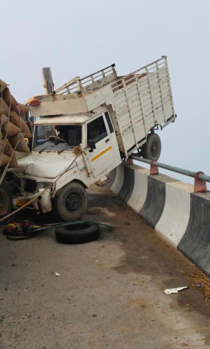 गाजीपुर। जमानियां धरम्मरपुर पक्का पुल पर शनिवार तड़के घने कोहरे के कारण बड़ा हादसा हो गया। धान लदा एक ट्रैक्टर-ट्रॉली और गौ-वंशो से लदे पिकअप की आमने-सामने की जोरदार टक्कर हो गई। टक्कर इतनी भीषण थी कि पिकअप का पिछला हिस्सा पुल की रेलिंग पर चढ़ गया। जिससे पुल पर कुछ देर के लिए अफरा-तफरी मच गई। हादसे के बाद ट्रैक्टर और पिकअप चालक मौके से फरार हो गए। सूचना मिलने पर पुलिस मौके पर पहुंच गई। पुलिस ने क्रेन की सहायता से पिकअप को सुरक्षित पुल से नीचे उतारकर कोतवाली पहुंचाया। संयोग रहा कि कोई बड़ा हादसा नहीं हुआ। पुलिस के अनुसार घने कोहरे के कारण दृश्यता काफी कम थी, जिससे यह दुर्घटना हुई। पुलिस फरार चालकों की तलाश कर रही है।