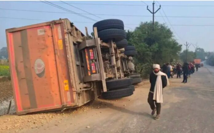 गाजीपुर। गहमर कोतवाली क्षेत्र के बकैनिया मोड़ के पास बुधवार सुबह गिट्टी लदा एक ट्रेलर अनियंत्रित होकर पलट गया। हादसे में गाजीपुर निवासी सह-चालक दिनेश कुमार (32) की मौके पर ही मौत हो गई, जबकि चालक गंभीर रूप से घायल हो गया। ट्रेलर अहरौरा से गिट्टी लेकर बिहार के चौसा पावर प्लांट जा रहा था। बताया जा रहा है कि अंधे मोड़ पर संतुलन बिगड़ने से वाहन पलट गया और गिट्टी सड़क तथा खेतों में फैल गई, जिससे दोनों लोग घायल हो गए।सूचना पर पहुंची गहमर कोतवाली पुलिस ने स्थानीय लोगों की मदद से घायलों को सामुदायिक स्वास्थ्य केंद्र भिजवाया, जहां डॉक्टरों ने दिनेश को मृत घोषित कर दिया। घायल चालक ने बताया कि वाहन मालिक का नाम मंगल यादव है और दिनेश छुट्टी पर अपने गांव लौट रहा था। कोतवाली प्रभारी निरीक्षक प्रमोद कुमार सिंह ने बताया कि मामले में आवश्यक विधिक कार्रवाई की जा रही है। हादसे से क्षेत्र में शोक व्याप्त है।